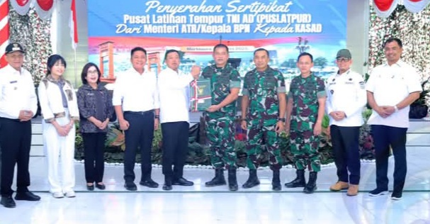 OKU Timur | Informasinews.id – Penyerahan Sertifikat Lahan Pusat Latihan Tempur (Puslatpur) dari Menteri Agraria dan Tata Ruang/Kepala Badan Pertanahan Nasional (ATR/Kepala BPN) Republik Indonesia kepada Kepala Staf TNI Angkatan Darat (Kasad), bertempat di Puslatpur Martapura Kabupaten OKU Timur Sumsel, Rabu (12/03/2025).
